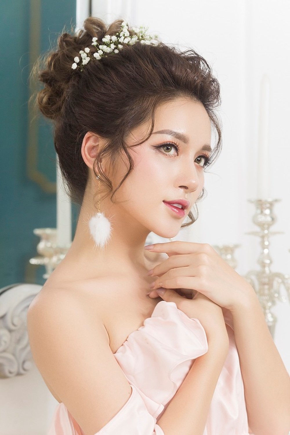 Luôn mang đến vẻ đẹp ngọt ngào, quyến rũ và vương giả, kiểu tóc này là “cứu tinh” cho những cô dâu mặt chữ O tròn trịa.