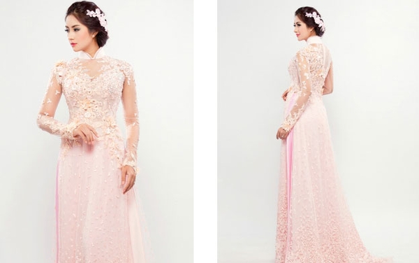 Nếu tông màu hồng sen đậm khiến cô dâu nổi bật thì tà áo dài màu hồng nhạt lại mang tới vẻ dịu dàng nữ tính, lãng mạn cho tân nương. Khi kết hợp với các chi tiết trang tri sang trọng như ren, cườm đá pha lê hay các họa tiết hoa nổi chiếc áo dài cưới màu hồng pastel sẽ càng thêm lộng lẫy
